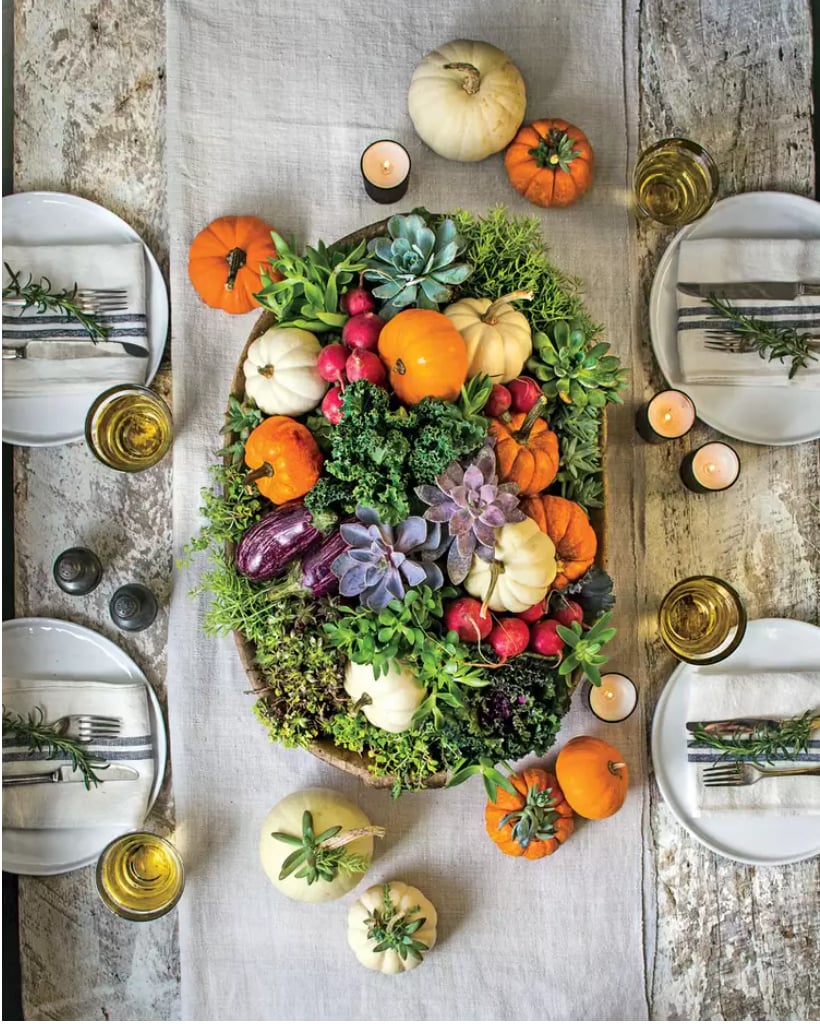 Talk about farm-to-table: Let this colorful, free-form twist on the cornucopia take a starring role. Nestle mini pumpkins among the seasonal greens and succulents in a tray or basket.
