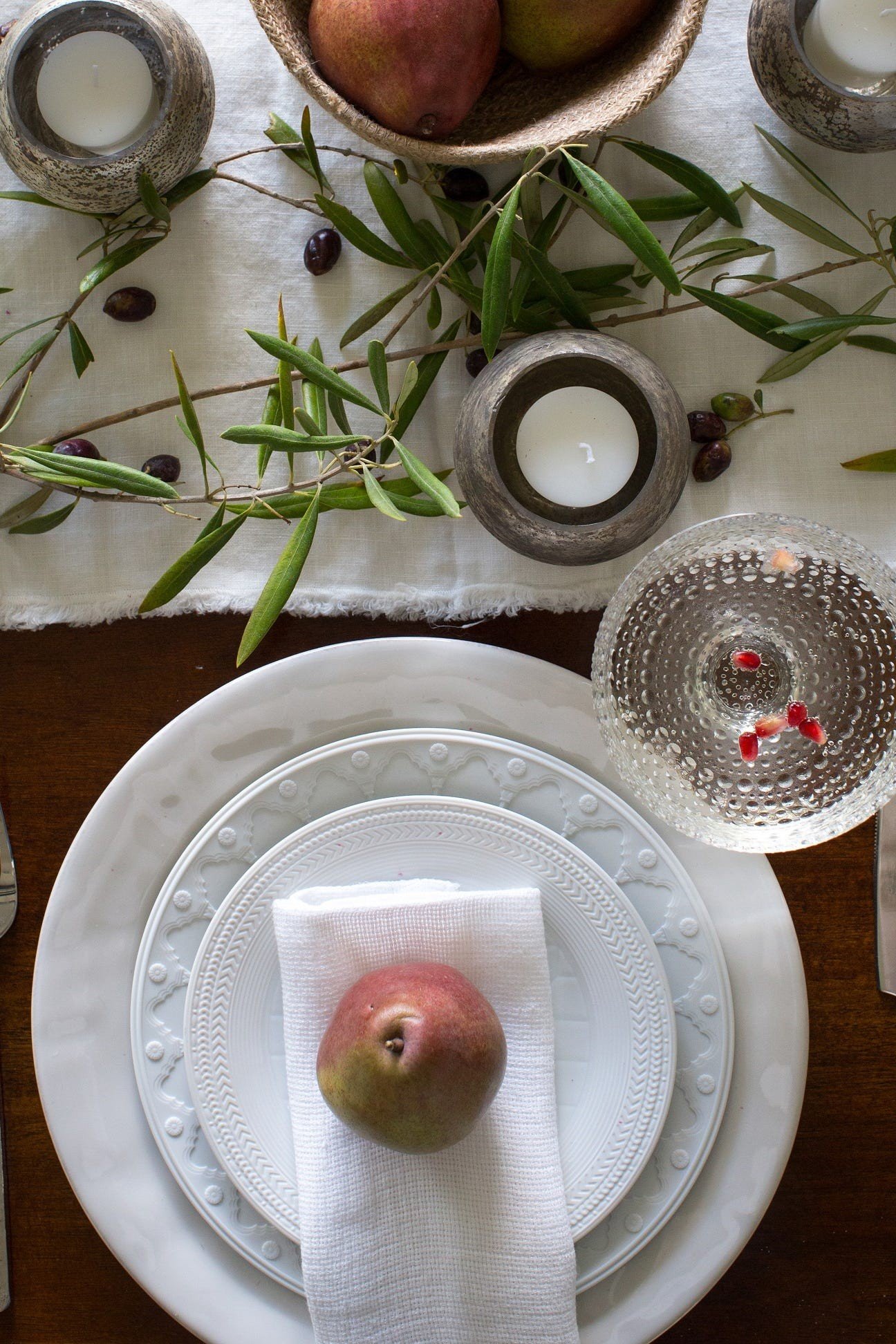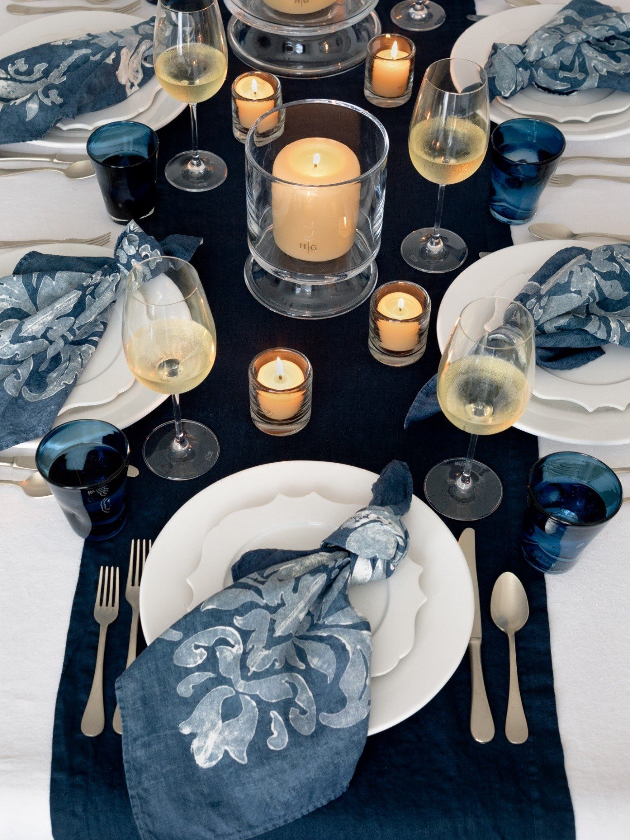 For Marie Flanigan, subtlety is key. Instead of overwhelming her table with large, colorful gourds, the interior designer kept it simple by layering olive branches over a crisp, white table runner. Tea lights, woven fruit baskets, and mismatched china round out the look, creating a cozy, homey atmosphere. Thanks to its unparalleled versatility, this is one table decor idea you can enjoy year-round.