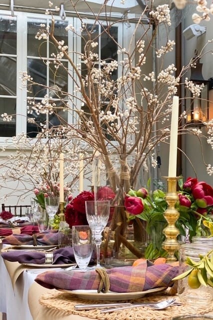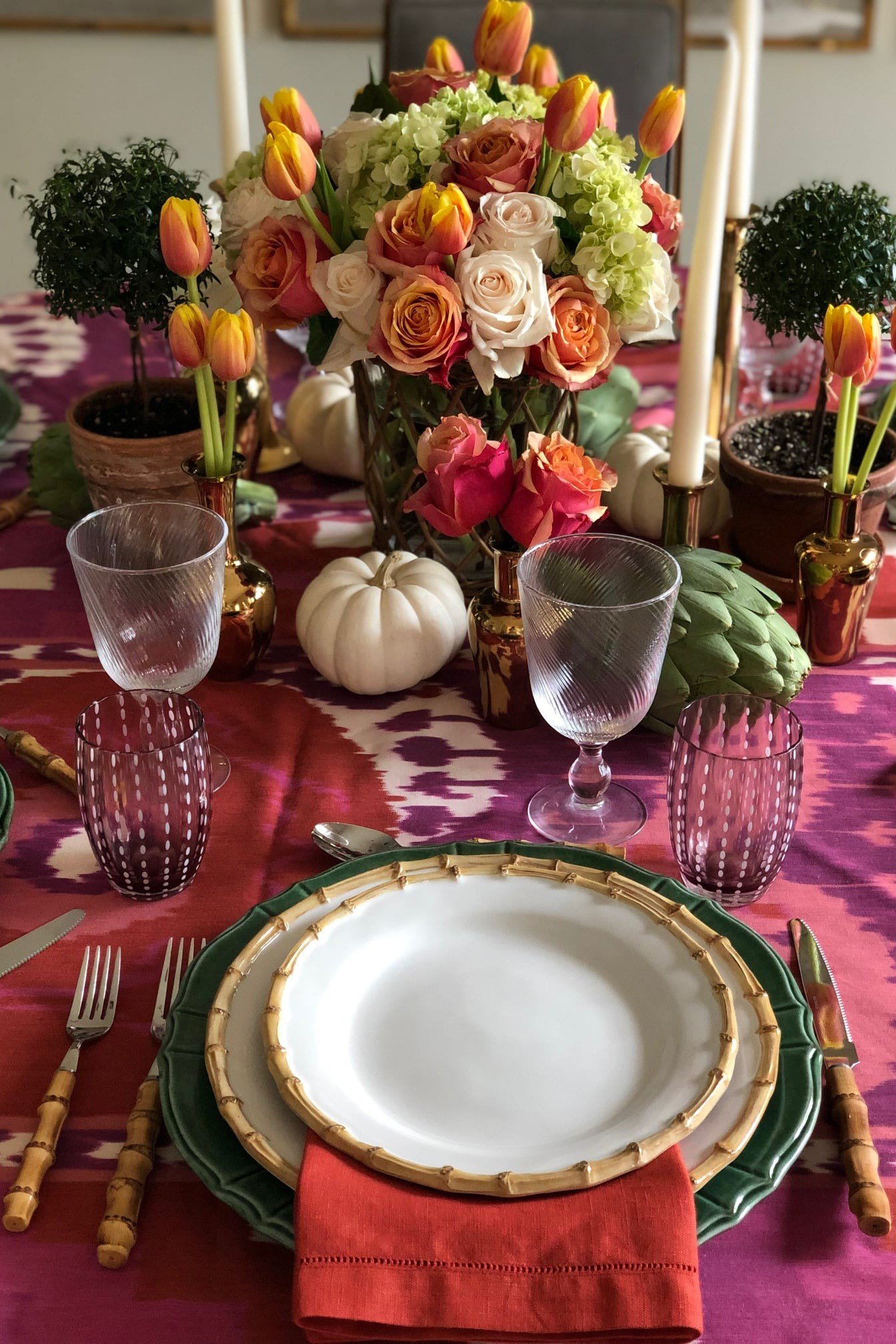 Jenny Dina Kirschner of JDK Interiors strikes a balance between laid-back and luxe by pairing her formal china with a checkered tablecloth. “There’s something about the juxtaposition of it all that feels warm and inviting, rather than formal and pretentious,” the designer explains. If you want to give your tablescape a seasonal spin, swap out the tulips for some chrysanthemums.