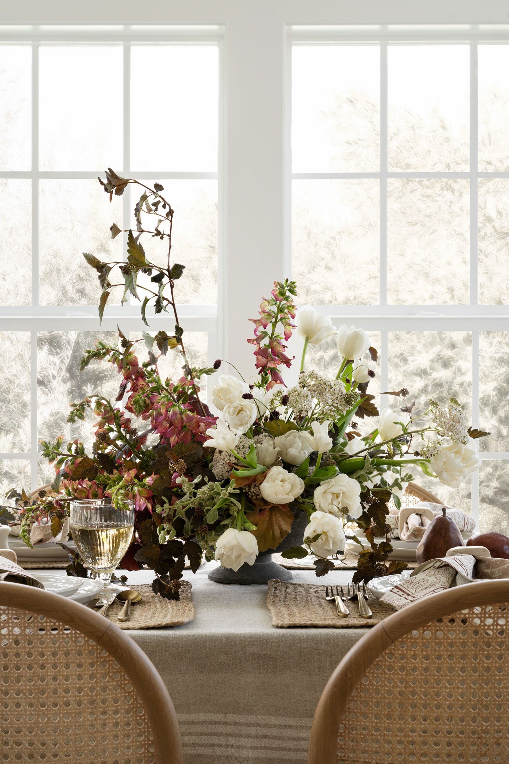 If you’re going to go all out on one element of your Thanksgiving tablescape this year, make it your flower arrangement. Here, Shea McGee placed an overflowing bouquet of white tulips, pink snapdragons, and lush greenery amid an otherwise neutral table. Burlap napkins and clear glassware let it all shine.