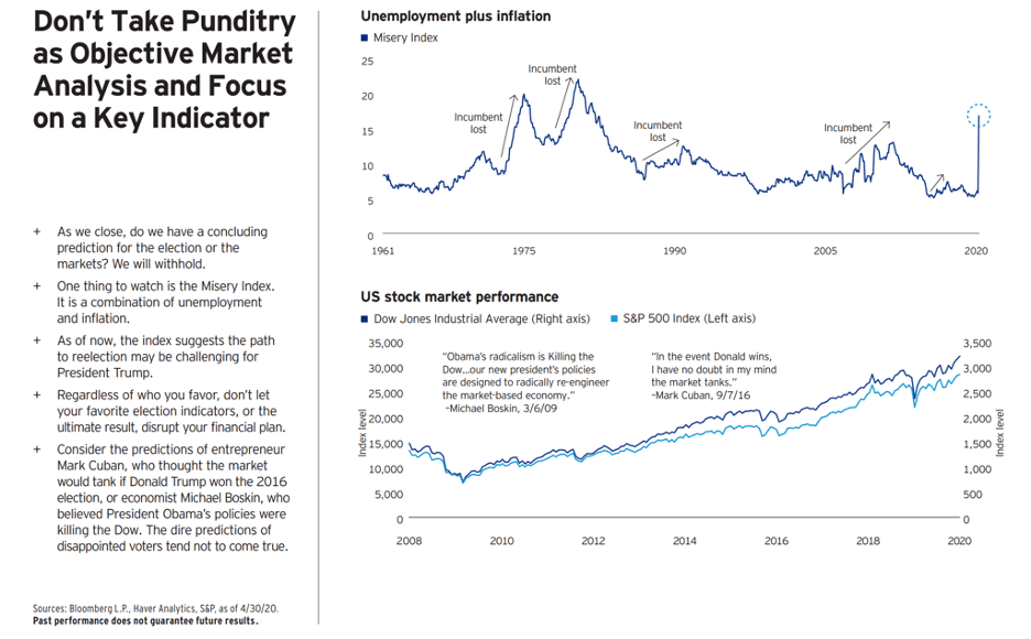 Other factors – like the decisions made by the US Federal Reserve – have a much greater impact on market sentiment than any sound bite we hear from politicians. Several years ago, we coined a phrase that bears repeating: “Hating the government is not an investment strategy.” This election season will be no different from the prior ones, and investors should brace themselves for vitriol on both sides of the political spectrum. Rest assured, investors have prospered in markets even during difficult political times. The average return of the S&P 500 Index is approximately 11% since the end of World War II, even though we’ve had impeachments, additional wars and ambitious new spending. While we can’t say with any certainty who will win in November 2020, we can say for sure that staying the course has always made the most sense for investors. Even in the middle of a recessionary environment related to the impact of COVID-19, investors should focus on staying buckled in and look past the headlines to the underlying story that really matters. What Lincoln said in the nineteenth century remains wise advice for 2020: stand firm.