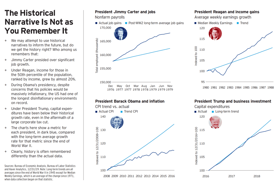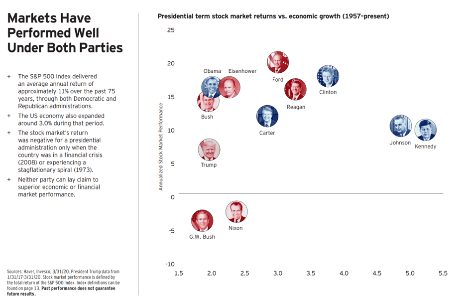 Coronavirus has upended the traditional cadence of an American presidential election year. 2020 is still an election year, however, and the campaigns will go on. While the election will have a momentous impact on the country, one area where we caution investors from drawing too many links to is the world of investing. Politics and investing have always been spoken about in the same breath. Market commentators, and even presidents themselves, have linked the performance of the stock market as a sort of “barometer” of the effectiveness of a president’s policies. The data don’t support this link, and investors would be wise to think critically before making an investment decision based on who’s occupying the White House. Over the past 120 years, the long-term performance of the market has shown almost no correlation with government policies. Instead, the key drivers of stock market performance have been earnings and economic growth. Much of our collective memory about the performance of the economy under various past presidents stems from historical narratives, not hard data.