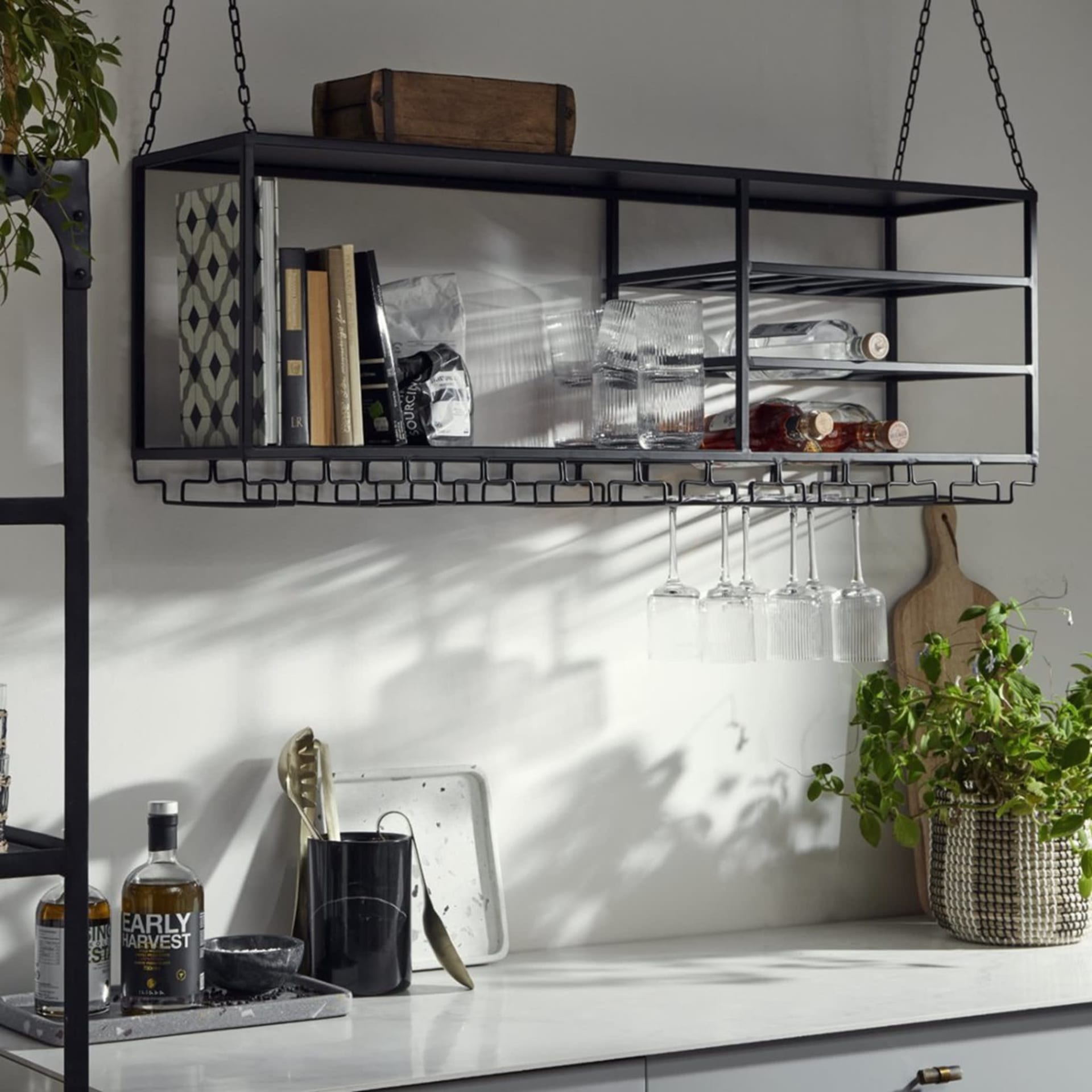 We all need our Friday night vino fix so ensure your glasses are always on hand. Many open shelves such as this, the Melli hanging shelf, come with in-built wine glass and bottle storage. Ensure you pair with oversized, ultra-thin glasses to capture an opulent look.