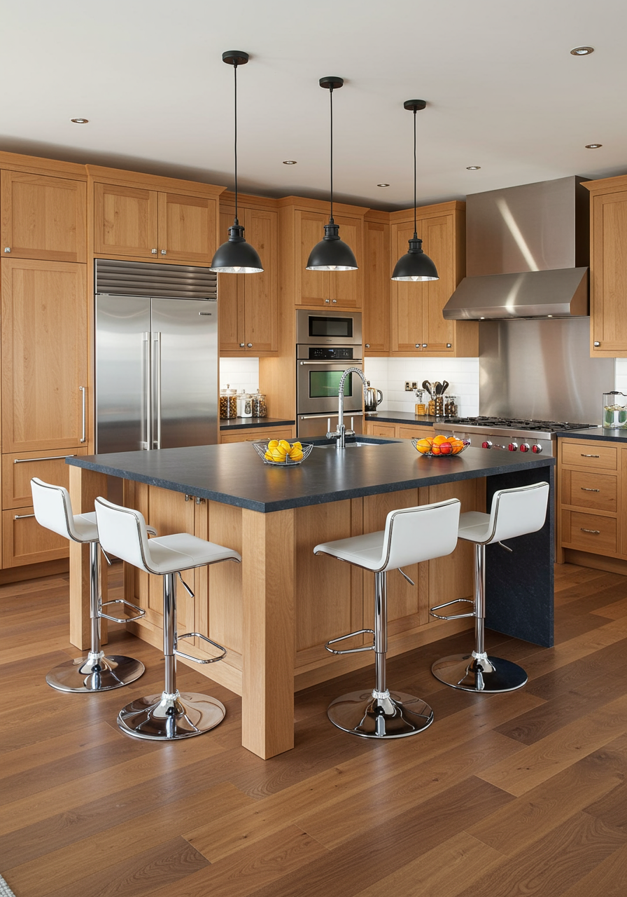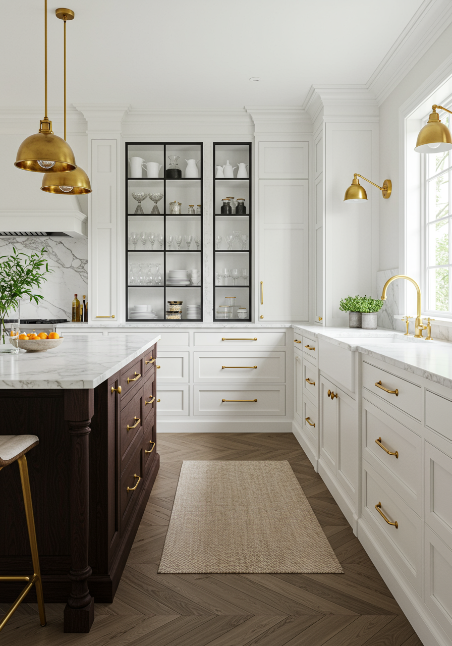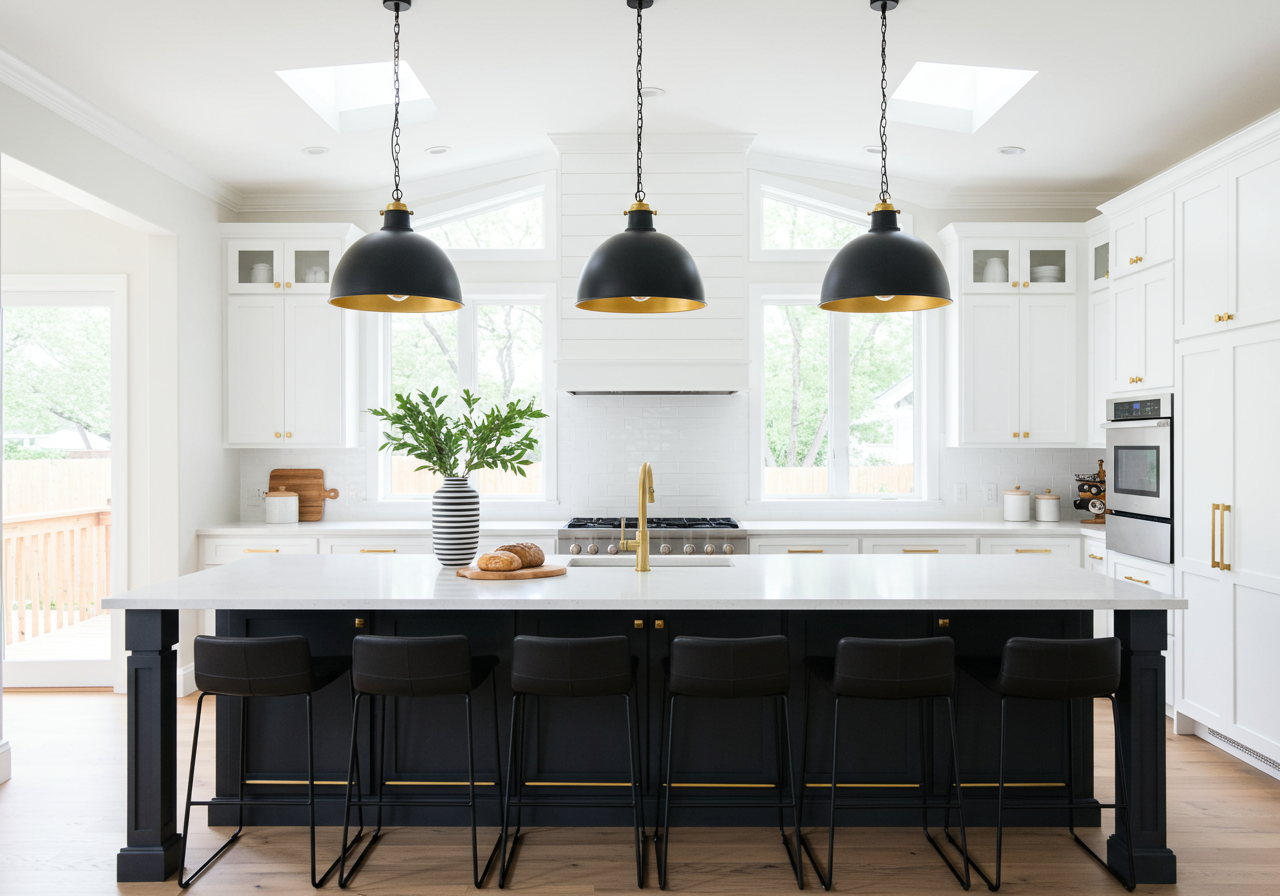 Below, I will incorporate the cabinet style and possibly the island with legs in black.
