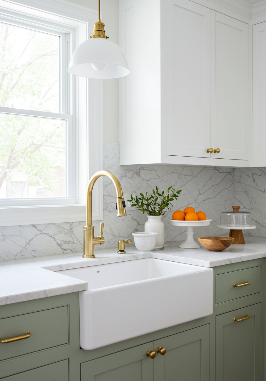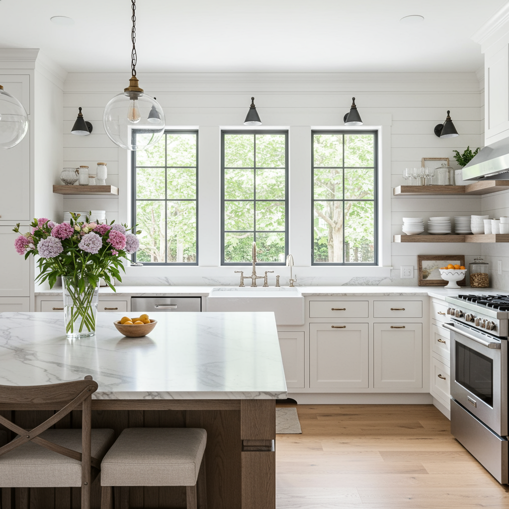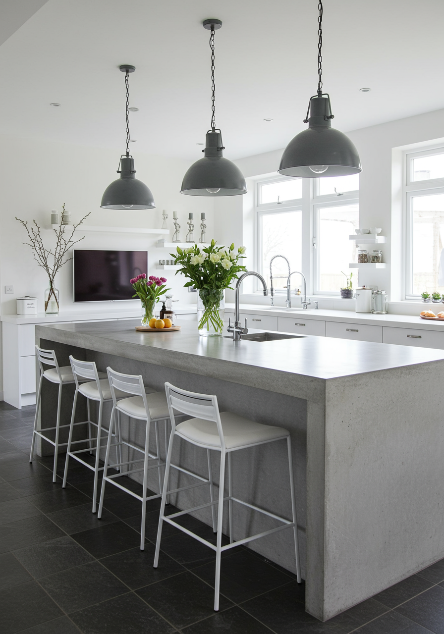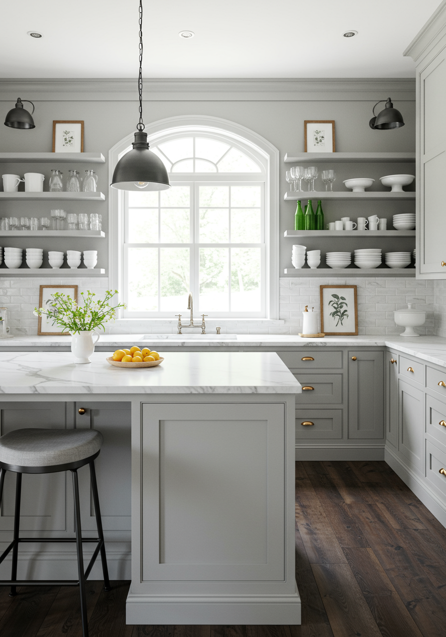 Clean, mean, and timeless. The basic white and grey palette also offers endless possibilities to highlight colorful additions – a bowl of fruit, a bunch of colorful flowers, greens, or brightly colored dinnerware.
