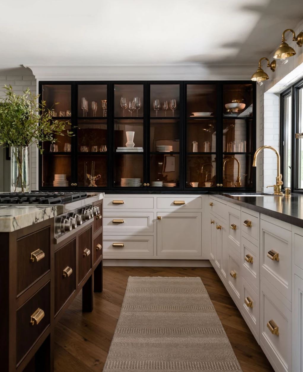 And finally, my vision for the LA house is 90% this design and 10% the design below. The island will not be waterfall-style or planked. Just the color scheme: Black or dark gray, white and gold. I am going to use Calcutta porcelain for the counters and backsplash with gold long pulls. Better counter stools too!