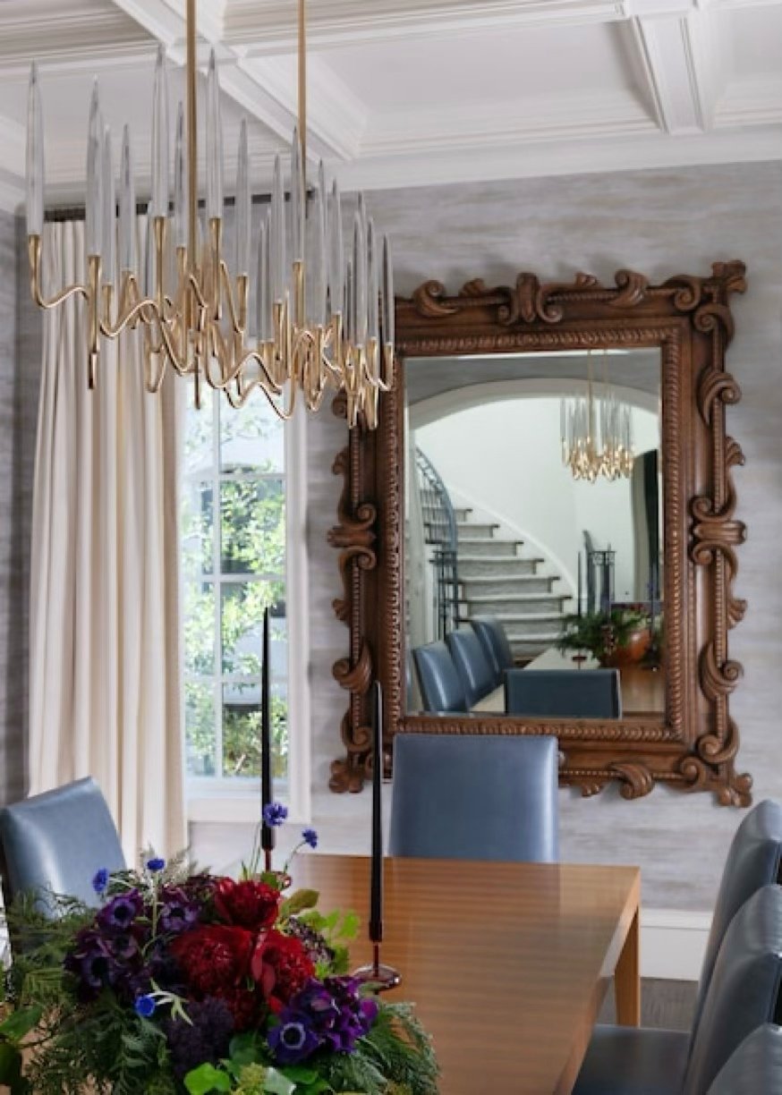 A dramatic chandelier in a Roz Murphy design draws on two trends: sculptural lighting and metal finishes.