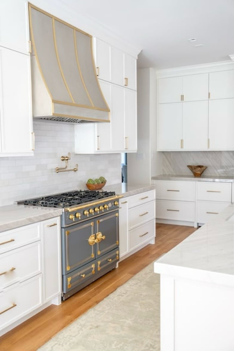 “Metal finishes are all the rage entering the new year, especially when they’re integrated in more architectural ways,” Murphy says. “We’re seeing brass insets applied directly to cabinet fronts, strapping details on kitchen hoods, and dramatic cabinet hardware have a major moment. These elements add another layer of depth, turning functional surfaces into design features.”